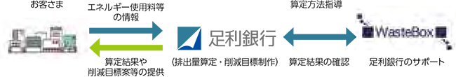 常陽銀行および足利銀行では、GHG排出量削減に寄与する省エネ設備導入にあたってのファイナンス支援や、カーボンクレジットの活用などの具体的な削減施策の提供にとどまることなく、脱炭素化へ取り組むに際して最初に取り組むべき『排出量の算定・可視化』『削減目標・計画の策定』など、初期の段階からお客さまをご支援することで、脱炭素経営に関する包括的なサポートを行っています。