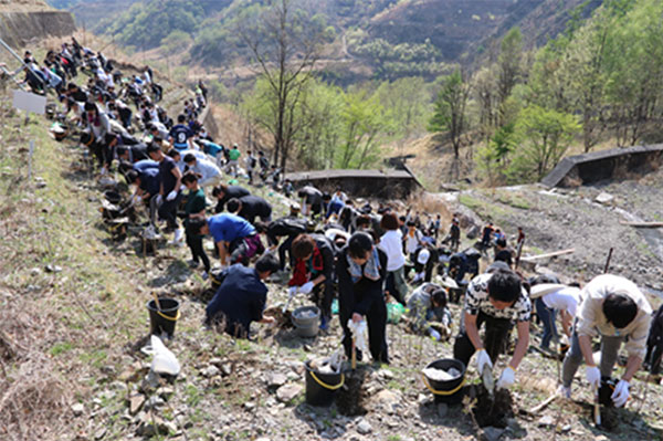 足利銀行は、煙害で荒廃した足尾の山の緑化活動とともに水循環系としての渡良瀬川源流地域の問題を考え、自然環境の健全化に取り組んでいる「NPO法人 足尾に緑を育てる会」の活動に賛同し、新入行員と栃木県産業協議会の会員企業新入社員で植樹を行っています。