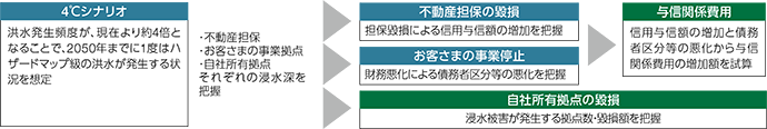 国土交通省の公表資料等を参考に、4℃シナリオ下でハザードマップ級の洪水が発生する状況を想定し、「不動産担保の毀損」と「お客さまの事業停止に伴う財務悪化」による与信関係費用の変化を分析するとともに、今年度より、同様の状況における当社グループの「自社所有拠点の毀損」の分析を開始しました。