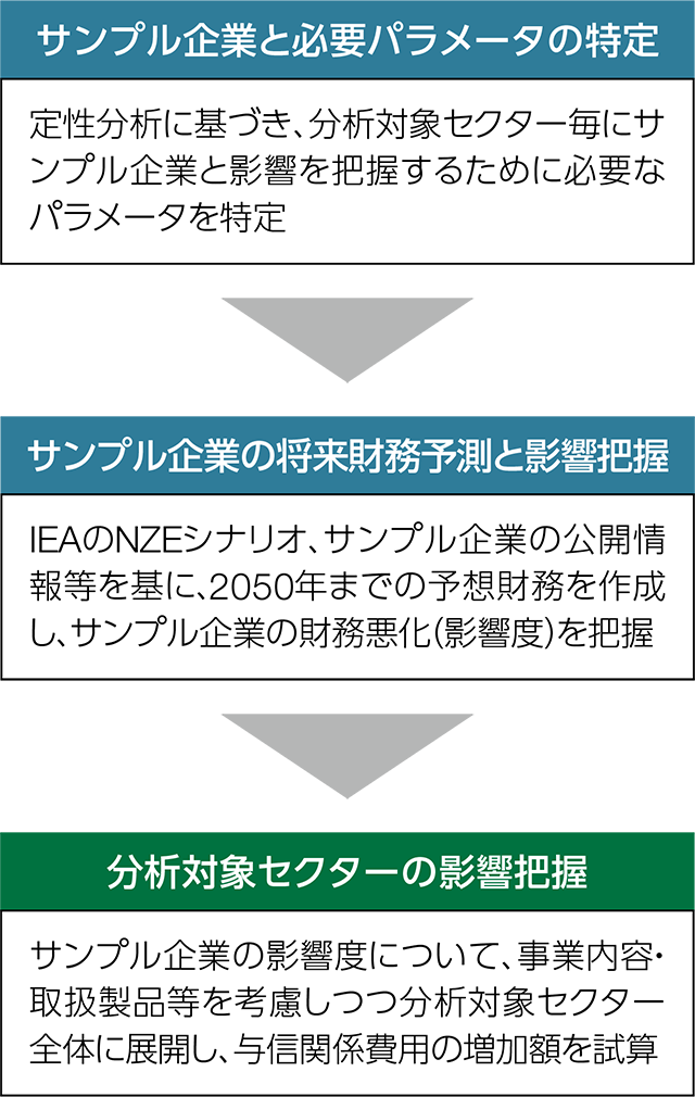脱炭素社会への移行に向けた「炭素税の導入」「お客さまの取り組み」「市場の変化」等による影響について、定量分析を実施しています。具体的には、国際エネルギー機関(IEA)の「Net Zero by 2050(NZE)」シナリオの予測データやサンプル企業の公開情報等を基に、「脱炭素社会への移行に伴うお客さまの財務悪化」による当社グループにおける与信関係費用の変化を分析しています。