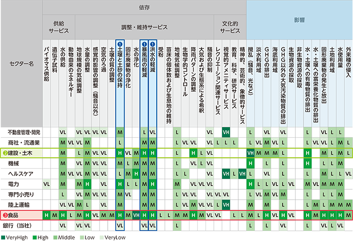 - ※ENCORE…国連環境計画世界自然保全モニタリングセンター(UNEP-WCMC)や自然資本金融同盟(NCFA)などによって開発された分析ツール。セクターごとの自然への依存度や影響度などの分析が可能。