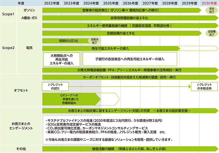 サステナビリティ長期KPIである「2030年度CO2排出量ネット・ゼロ(Scope1、2)」の達成に向け、ロードマップ(2022年6月作成)に基づき、当社グループの事業活動における排出量削減に取り組むとともに、エンゲージメント活動を通じてお客さまの脱炭素化支援を進めています。