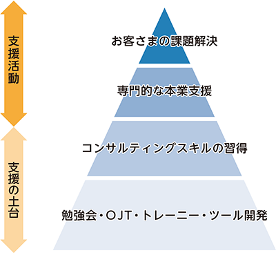 お客さまの抱えるさまざまな経営課題に対し、業務効率化に向けたITデジタル化や中長期的な経営戦略に関する計画の策定をはじめ、本業支援を目的としたコンサルティング支援を行っています。その支援の過程における「現状分析→課題抽出→実行支援」をワンストップで対応することで、各分野の専門家が連携し、より質の高い伴走支援ができるよう取り組んでいます。