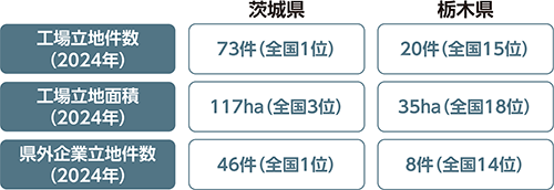 茨城県・栃木県は、首都圏に隣接し、鉄道や高速道路などの高速交通網が整備されており、工場立地件数および立地面積、県外企業立地件数は全国上位となっています。従業員の通勤、物流の面でも利便性が高く、企業にとって魅力的な環境です。新たな企業進出は、地元の雇用創出や地元企業の需要拡大につながり、地域経済を活性化させる効果が期待できます。