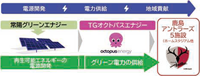 2025年7月には、「オフサイトPPA」への取り組みとして、TGオクトパスエナジー株式会社を通じ、茨城県内で開発した再生可能エネルギー電源を含むグリーンエネルギーを、鹿島アントラーズのホームスタジアムを含む5施設へ供給を開始しました。
