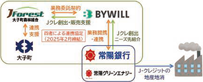 カーボンオフセットに向けた取り組みでは、2025年2月に、常陽銀行において茨城県大子町、大子町森林組合、株式会社バイウィルとの間で、「森林資源による環境価値の創出に向けた連携に関する協定」を締結しました。